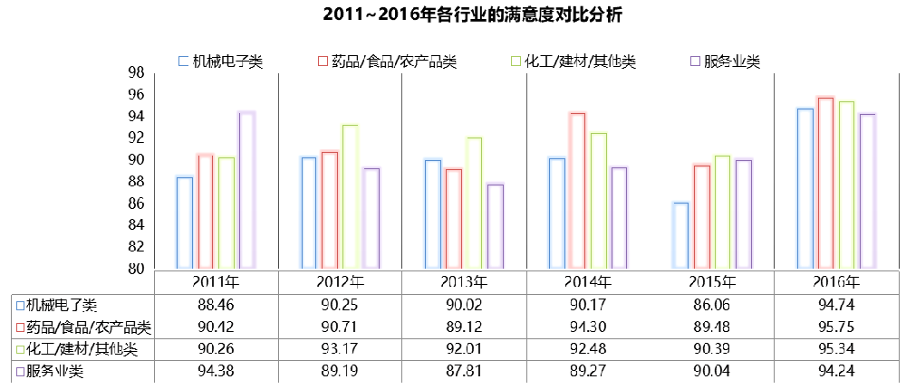從近六年的滿意度對比來看,2016年機械電子類、藥品/食品/農產品類、化工/建材/其他類的顧客滿意度均達到最高點,值得表揚,與去年相比,今年的顧客滿意度均有較大幅度的提升,應繼續保持。